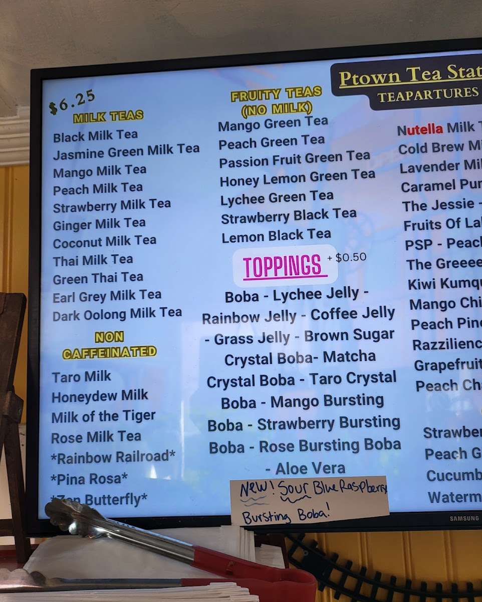 For those looking for refreshing beverages, the menu includes bubble teas, chai and matcha lattes, fruit smoothies, and specialty drinks such as hot cocoa and energy-boosting sodas.